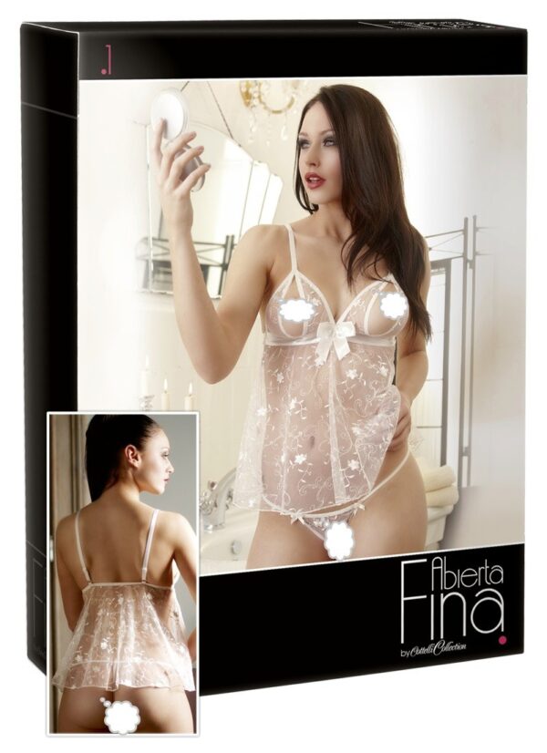 Babydoll bianco in pizzo by Abierta Fina, ampio svasato con coppe aperte sui seni e fiocco in mezzo ai seni. Incluso nella confezione anche string aperto.
