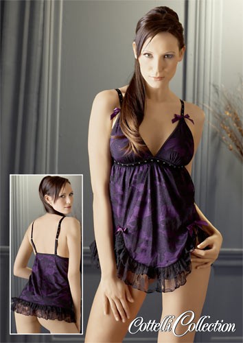 Babydoll corto, viola e nero. Svasato, con cristalli decorativi sotto il seno e le cinghie regolabili. Frangia con pizzo. Stringa con tassello incluso. Entrambi gli indumenti realizzati in tessuto viola con uno strato di pizzo.