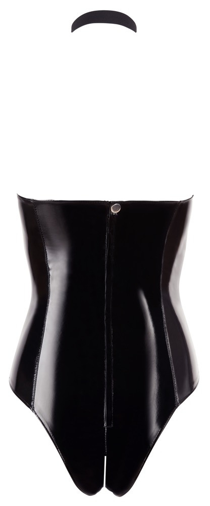 Body in vinile nero con scollo all’americana e allacciatura fantasia sul davanti che arriva fino al cavallo aperto. Con cerniera e bottone automatico sul retro. 100% poliestere con rivestimento in poliuretano.