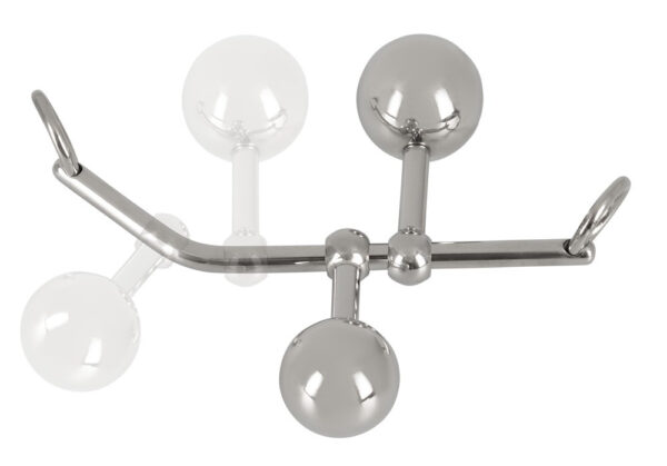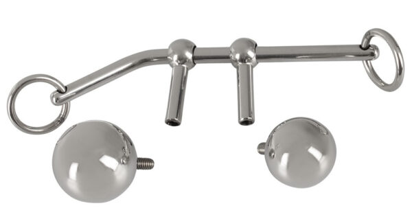 I 2 tappi a sfera di diverse dimensioni scorrono sulla barra liscia e sono quindi regolabili individualmente per chi li indossa. Le sfere possono essere svitate dai colpi e sostituite. Ogni estremità della barra ha un anello di fissaggio per la corda di bondage allegata, che viene legata al corpo/collo e fissa i ball plugs.