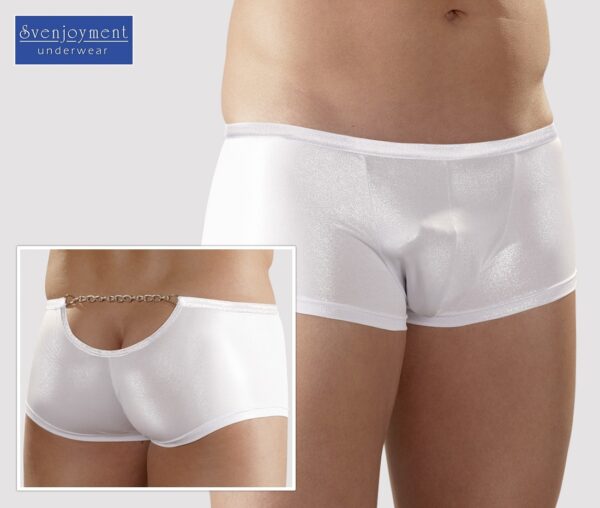 Fantastico boxer con effetto glitter bianco lucido. Dietro presenta una piccola apertura nella parte superiore connessa da catenella argentata.