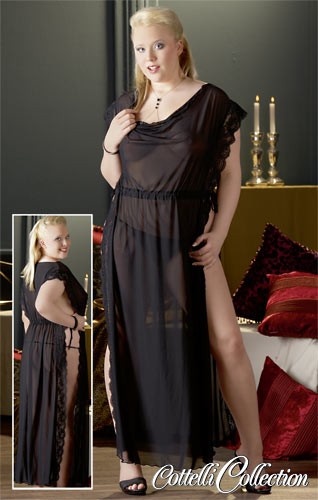 Splendida camicia da notte lunga in raso nero trasparente con aperture laterali…