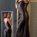 Splendida camicia da notte lunga in raso nero trasparente con aperture laterali…