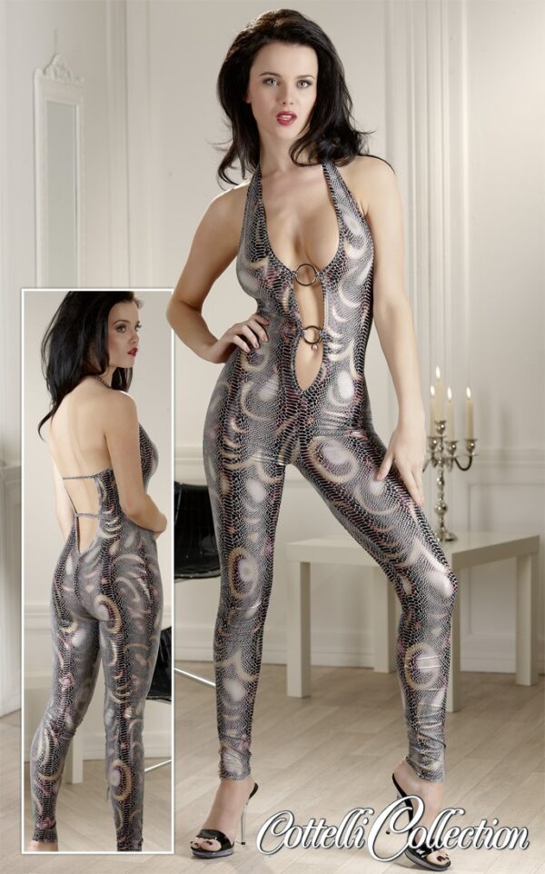 La tuta sexy by cottelli “Snake” aderente di colore grigio con disegni che ricordano la pelle di serpente. Una scollatura profonda sulla parte anteriore con due grandi anelli decorativi la rendono particolarmente sexy e maliziosa. Disponibile nel taglie ideale per una sera in discoteca all’ insegna della seduzione. • Materiale: 85% Poliammide, 15% elastan.