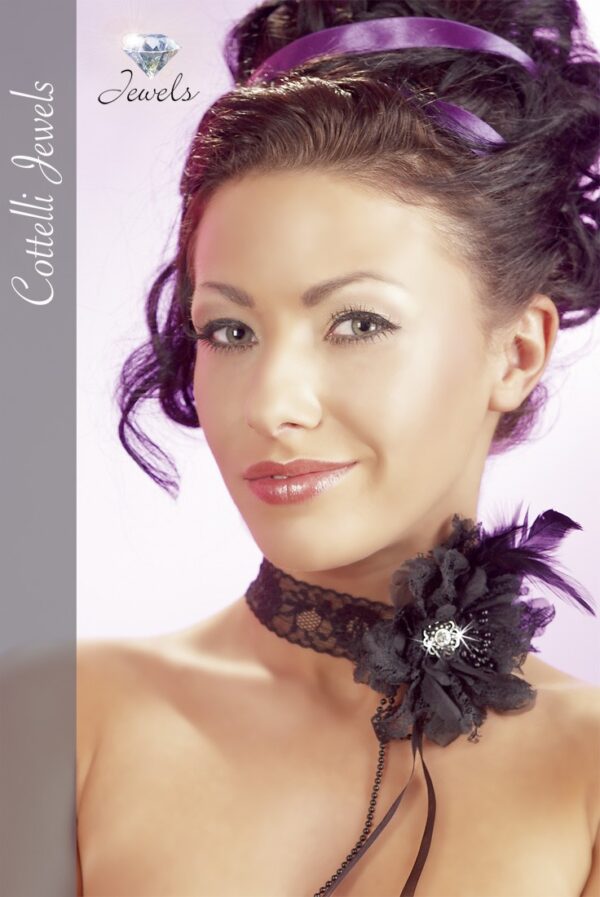 Collana pizzo nero con un fiore decorativo. Ornata di perle e strass. 100% poliestere.