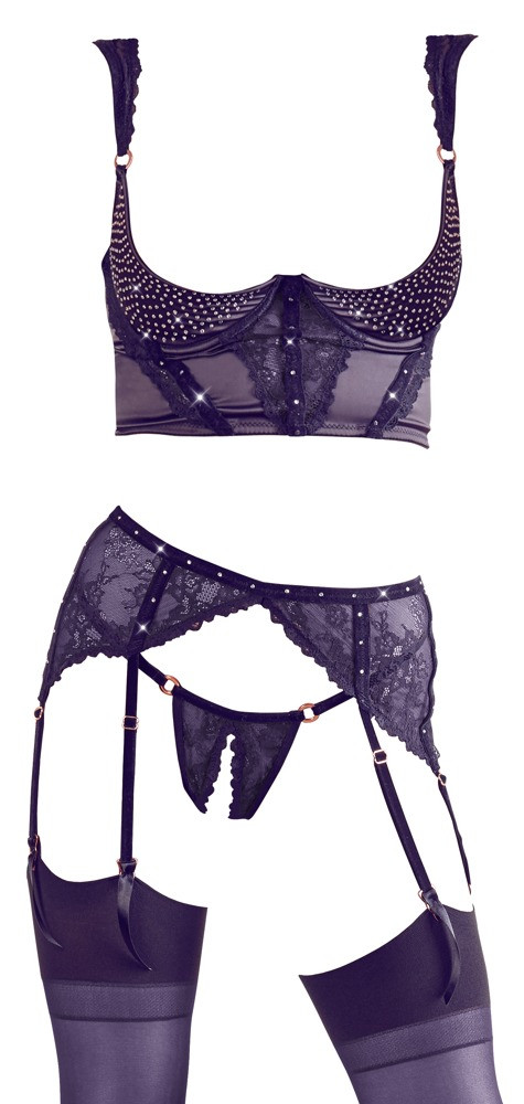 Un bellissimo set di 3 pezzi realizzato in pizzo e velluto. Il reggiseno a mensola ha coppe con ferretto leggermente imbottite ed è decorato con strass e spalline in velluto. Gli inserti in pizzo sul davanti e sulle spalline aggiungono una finitura elegante a questo outfit. Il cordino senza cavallo e il reggicalze con 6 bretelle sono realizzati quasi completamente in pizzo ma hanno anche cinturini decorativi in velluto. Le clip della bretella sono nascoste da un bellissimo nastro di raso. Il bustier ha una lunga chiusura a gancio mentre il reggicalze è fissato con una clip.