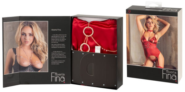 Basco con catene decorative color oro rosa e 4 bretelle. Le catene sono inoltre decorate con piccoli strass e anelli ricoperti di strass. Le catene portano al colletto che ha una chiusura a strappo. Le tazze hanno degli spacchi e sono anche decorate con un fiocco. Le fessure possono essere aperte con il piccolo gancio in modo che i capezzoli possano essere scoperti. C’è un gancio sul retro del basco e tutte le catenelle sono rimovibili. Il cordino abbinato è senza cavallo e ha un fiocchetto decorativo nella parte superiore dei glutei.