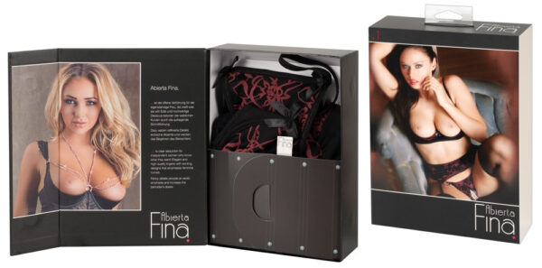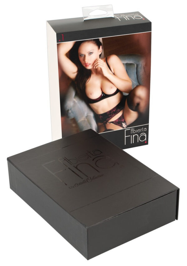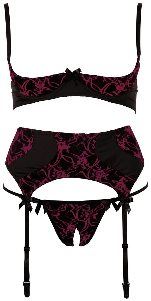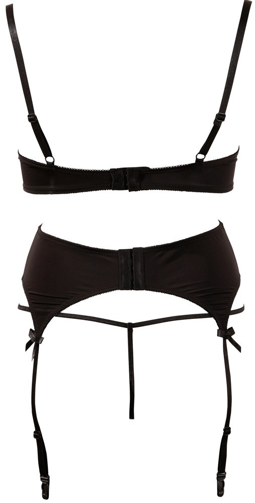 Pura potenza erotica femminile! Un completo come questo non può mancare nel guardaroba di una donna sexy. I colori scelti, cioè il nero e il rosso, pongono un bel contrasto tra il nobile rosso ricamato ed il nero-strasparente denota una forte voglia di sesso. Sprigiona tutta la tua voglia grazie al reggiseno a balconcino, allo string con apertura e i reggicalze coordinate. Coppa reggiseno con coppe leggermente imbottite e ampio reggicalze. Entrambi con chiusura a gancio nella parte posteriore. • Materiale: polyamide 85%, 15% elastane