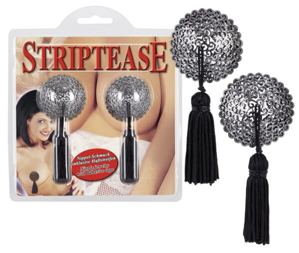 Copri capezzoli neri di forma tonda con pendenti. Adornati da strass con adesivo per una semplice applicazione.