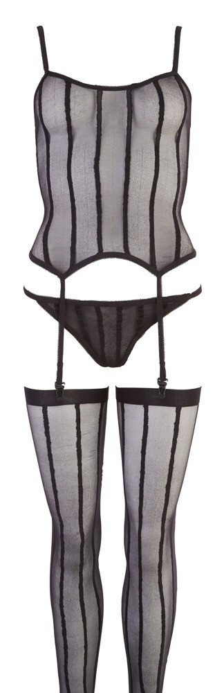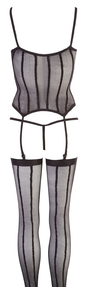 Sensuale e provocante. Ecco come questo corsetto coordinato formato da top, string, reggi calze a righe e calze vi farà apparire. • Colore: Nero. • Materiale: 100% poliammide.