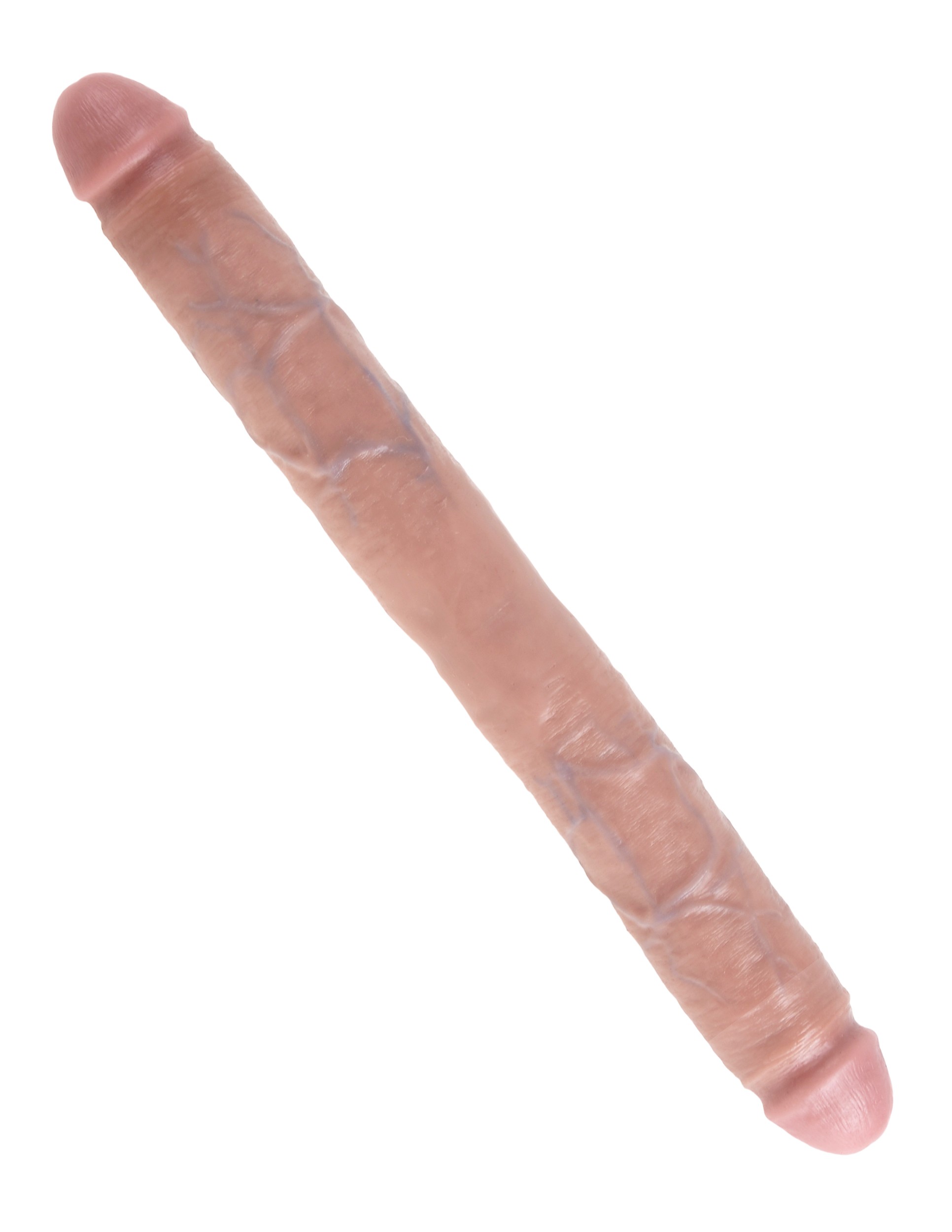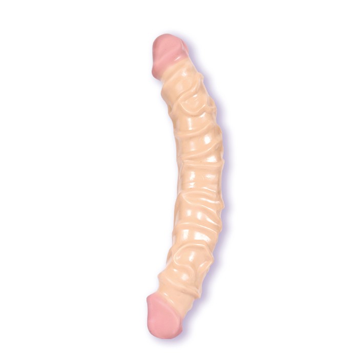 Fallo doppio trasparente dalla forma realistica con glande su entrambe le estremità e venature in rilievo sulla superficie. Ideale per il sesso lesbo o per la doppia penetrazione in quanto il materiale, TPR, consente di piegarlo ad U.
