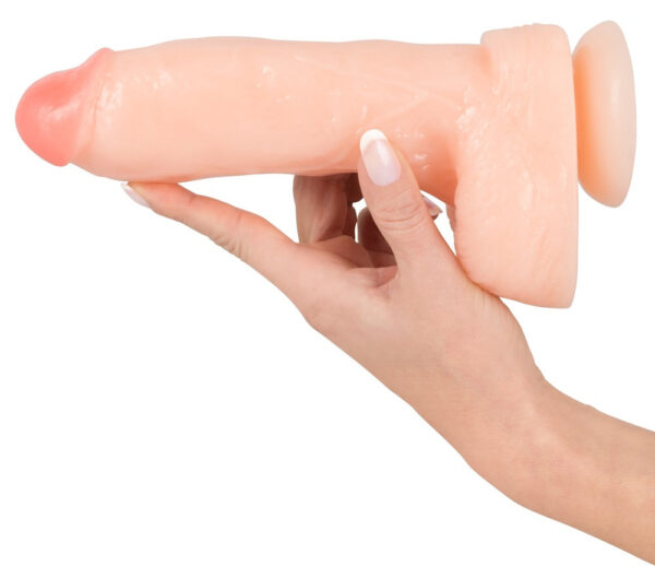Fallo realistico replica in color pelle con testicoli, cappella molto pronunciata e venature per stimolare la penetrazione.