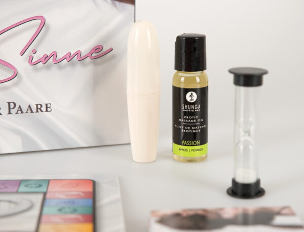 Gioco di coppia sensuale per 2 giocatori. Contenuto: regole del gioco, tavola da gioco con 2 dischi rotanti, 2 pedine, 1 dado, olio per messagi erotici, vibratore di potenza, 30 carte, 30 xoupon, clessidra, blocco notes con 2 matite e maschera per gli occhi. Lingua: Tedesco.