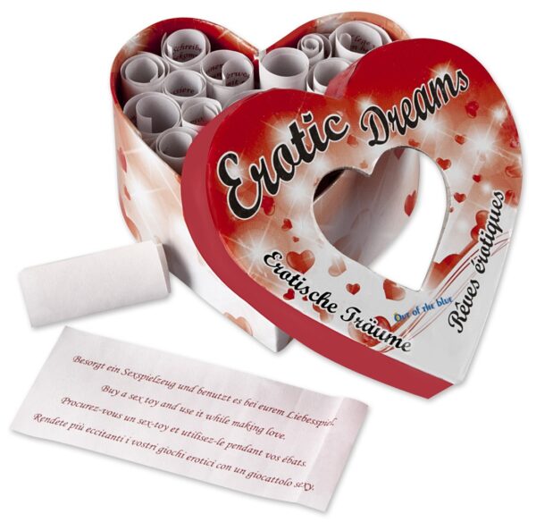 Cartone a forma di cuore, pieno di 21 rotoli di carta, ognuno di essi con elementi erotici e suggerimenti per le posizioni e le attività sessuali da svolgere insieme.