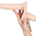 Per eccitanti giochi di ruolo o rapporti saffici. Coppia di vibratori (non separabili) color carne, a forma di pene, realizzati in lattice. Dotati di cinturino nero rimovibile in materiale simil-pelle.