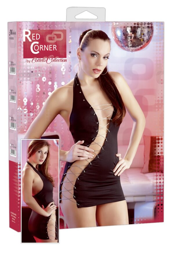 Mini abito con lacci by Red Corner. Aderente e super sexy questo abitino รจ trasparente in contro luce. Importante e sexy scollatura che prosegue sulla coscia destra . Per donne sicure di se e che vogliono stupire il pubblico maschile.