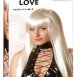 Parrucca color biondo platino, con capelli lunghi e lisci e frangetta incredibilmente sexy. E’ possibile lavarla con shampoo ed acqua.