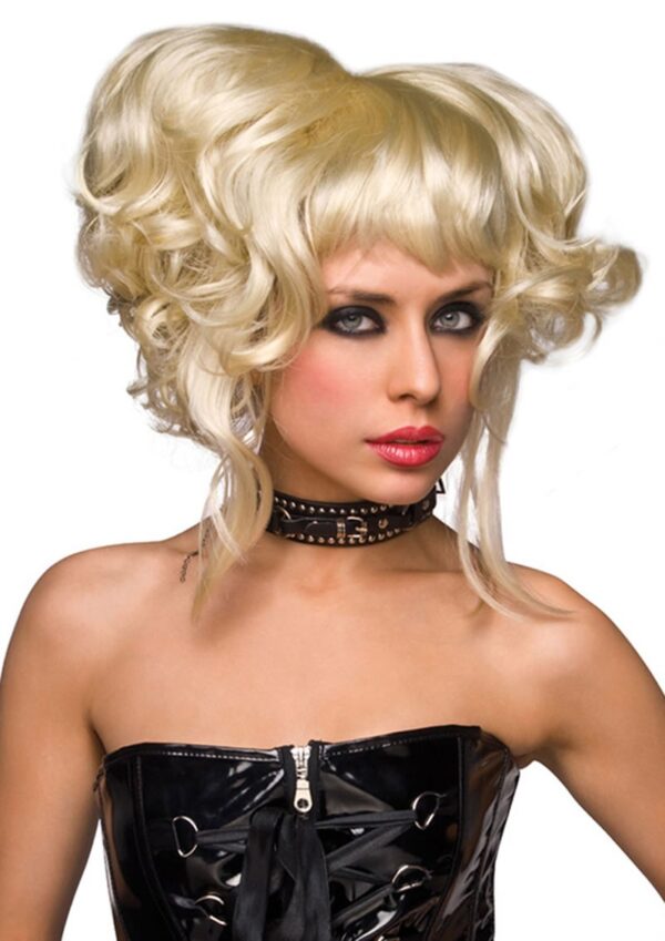 Splendida parrucca colore biondo platino con acconciatura a boccoli con ricci e frangetta.