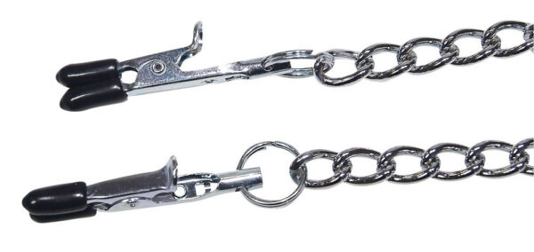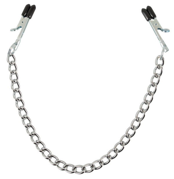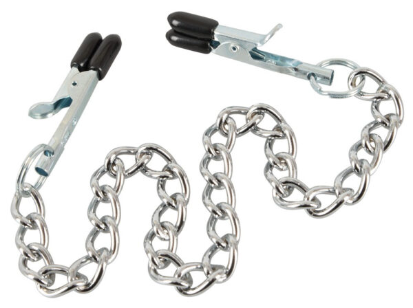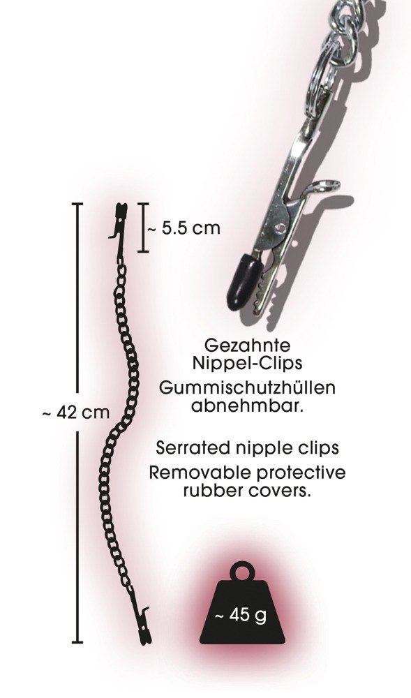 Sensazioni intense e lussuriose. Pinze per capezzoli dentate con guaina protettiva rimovibile. Lunghezza catena 30 cm. • Materiale: metallo.