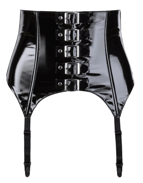Reggicalze extra largo in vinile nero con supporti per un sostegno ancora maggiore. Ci sono cinque fibbie decorative sul davanti e una chiusura a gancio con 2 file di ganci sul retro. Con quattro bretelle regolabili. 100% poliestere con rivestimento in poliuretano. Senza calze.