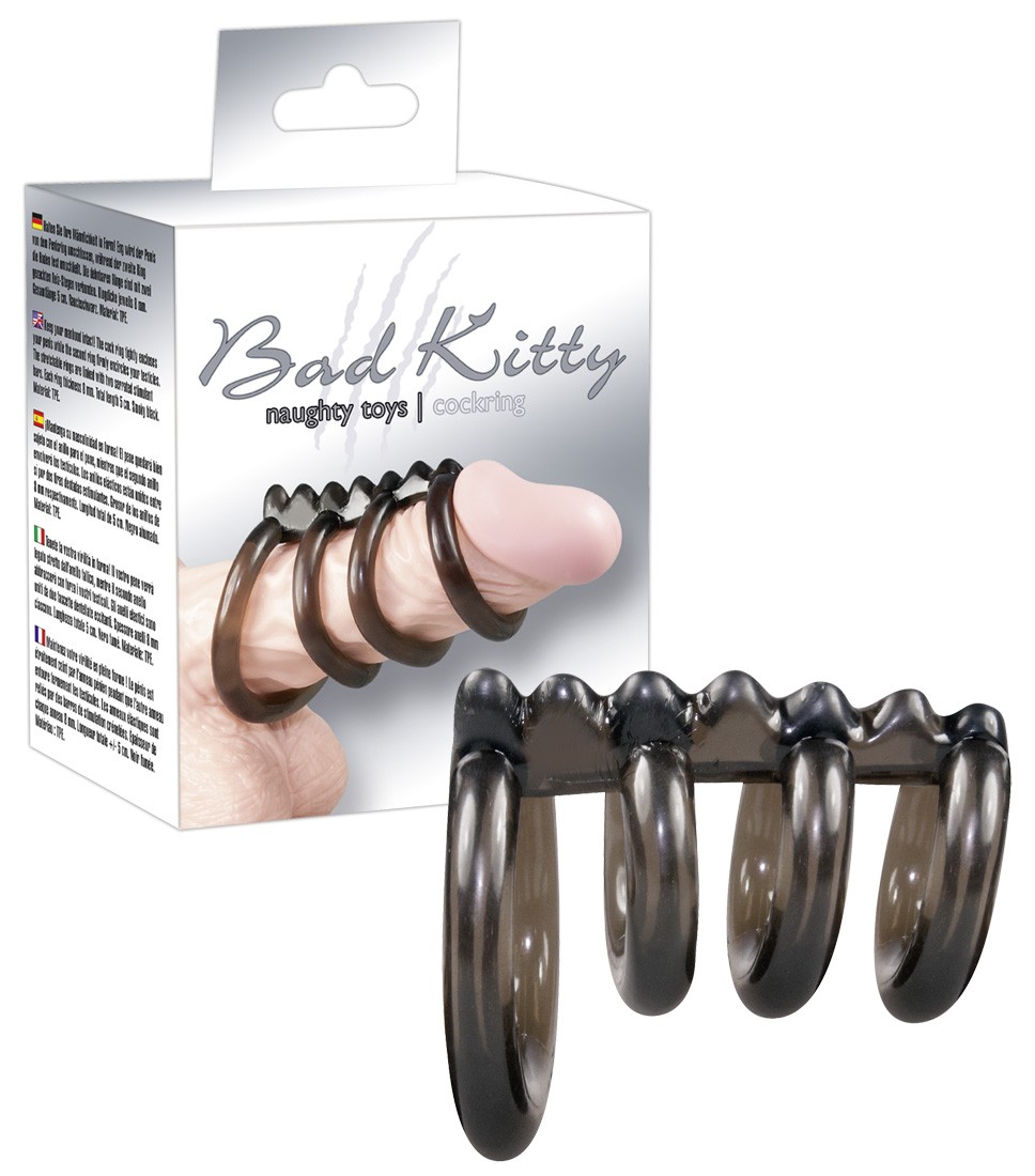 Kit composto da 3 anelli fallici, di varie dimensioni, di colore nero e con rilievi stimolanti. Possono essere indossati contemporaneamente posizionandoli su diverse parti o anche singolarmente scegliendo il diametro preferito.