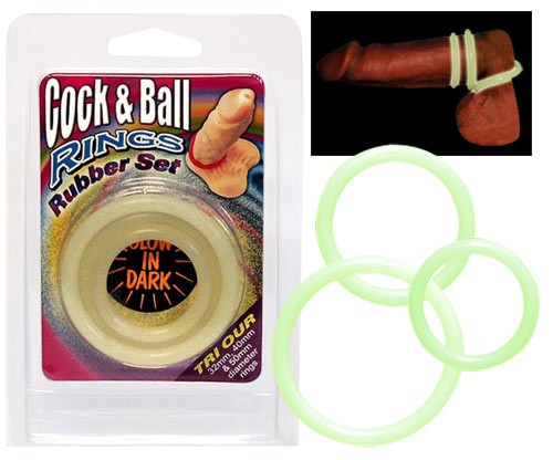3 morbidi anelli (di differente diametro) in gomma per pene e testicoli. Possono essere utilizzati separatamente. Contribuiscono ad aumentare il piacere ed a migliorare l’erezione. Inoltre essendo fluorescenti possono essere utilizzati per intriganti giochi al buio.