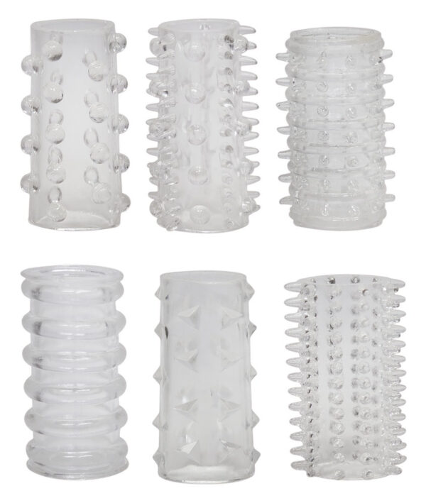 Set di 6 guaine falliche trasparenti in silicone medicale estremamente estensibili. Aumentano la durate dell erezione e ritardano l’ eiaculazione e grazie ai rilievi sul corpo esterno forniscono piacere intenso al partner sia per utilizzo anale che vaginale. Possono essere utilizzati anche sulle dite per una stimolazione intensa del punto G.