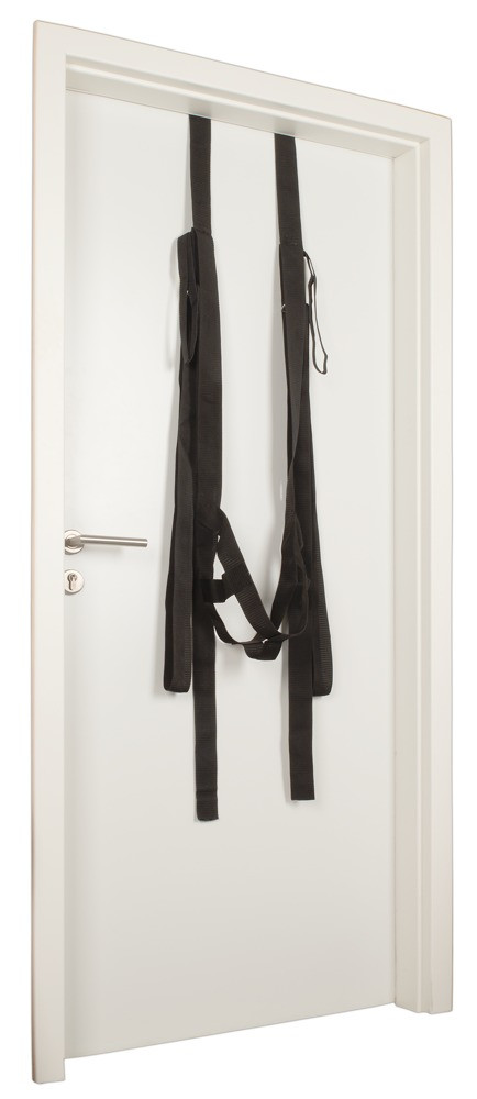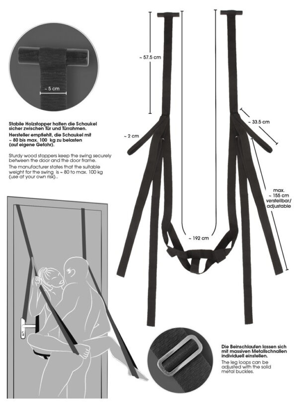 Porta a battente di Bad Kitty con cintura di sicurezza, passanti per mani e piedi regolabili. L’altalena dell’amore viene semplicemente appesa sopra la porta aperta e bloccata con i suoi robusti tappi di legno chiudendo la porta. Tutte le cinghie e gli anelli sono fatti di materiale intrecciato resistente allo strappo. Caricabile fino a 100 kg secondo la raccomandazione del produttore.