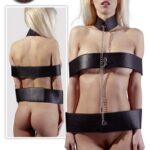 La costrizione del piacere. Rendi indifesa la tua preda impedendogli l’uso delle braccia con questa imbracatura bondage. Al collare sono fissati due costrittivi per fissare le braccia al corpo, catena di collegamento con moschettone. E’ realizzata in similpelle e i nastri sono regolabili tramite chiusura a velcro.