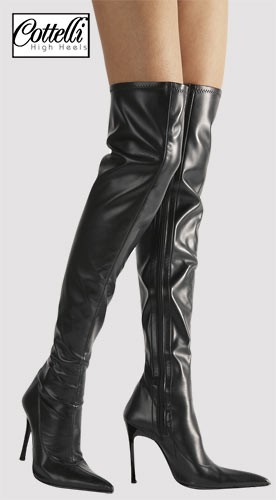 Stivali alti fin sopra al ginocchio in colorazione nero e materiale similpelle. Laccato all’altezza tacco. Comoda cerniera interna.