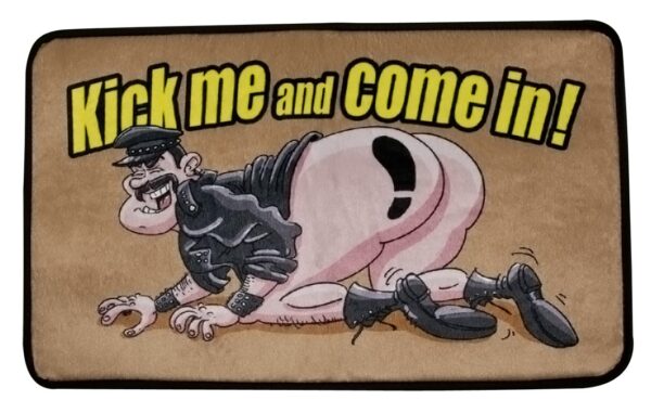 Divertentissimo tappeto con stampa uomo sadomaso e scritta calciami ed entra. Poche parole a buon intenditore!