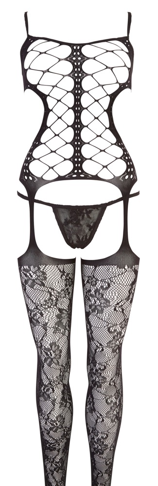 Struttura a fori e reti in combinazione con l’ottica del pizzo. Le calze sono intrecciate direttamente al reggicalze, il perizoma è incluso.