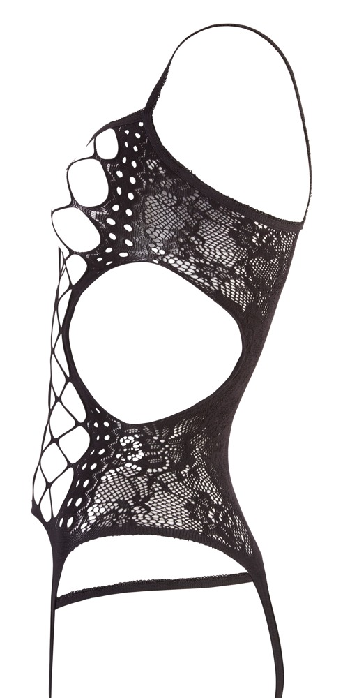 Struttura a fori e reti in combinazione con l’ottica del pizzo. Le calze sono intrecciate direttamente al reggicalze, il perizoma è incluso.