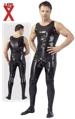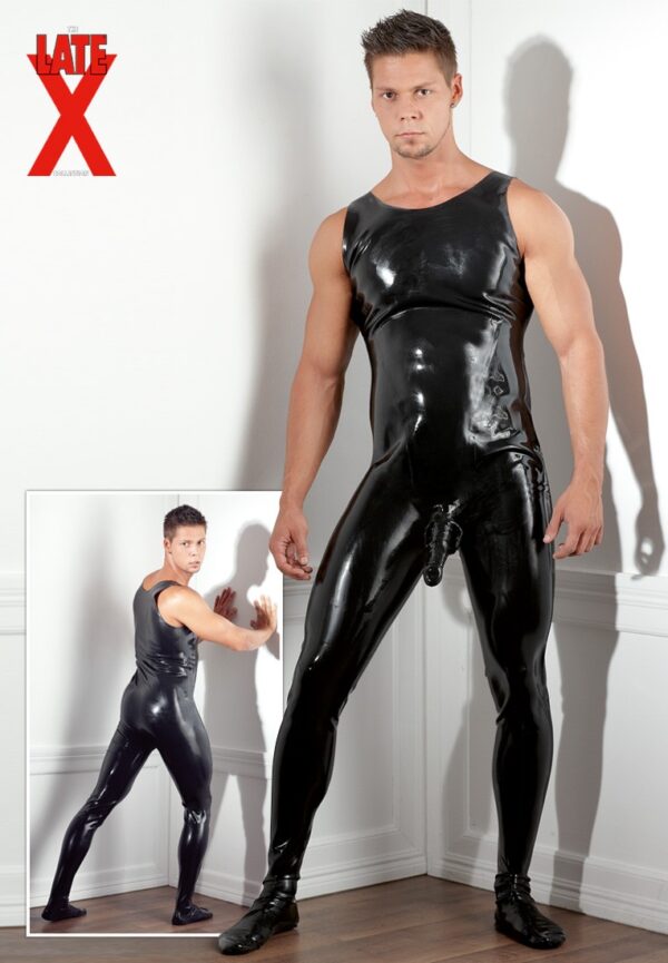 Tuta in latex senza maniche di colore nero. Realizzata con lattice extra spessore di 6 mm e munita di guaina per il pene.